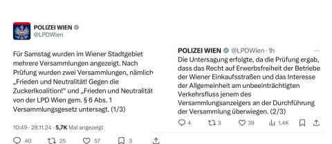 Am 28.11. und damit zwei Tage vor dem Termin, wurden zwei von mehreren für diesen Tag angemeldeten Versammlungen in Wien untersagt. Verboten wurden zwei Demonstrationen für „Frieden und Neutralität“, nicht untersagt wurde hingegen eine weitere mit dem Aufruf „Rechtsruck bekämpfen“. [Mittlerweile wurde eine neuerlich angemeldete Kundgebung erlaubt. (Anm. d. Red)] Als Begründung für die Untersagung nennt die Landespolizeidirektion Wien die „Erwerbsfreiheit der Betriebe der Wiener Einkaufsstraßen und das Interesse der Allgemeinheit am unbeeinträchtigten Verkehrsfluss“, die höher wiegen würden als jenes „des Versammlungsanzeigers an der Durchführung der Versammlung“.