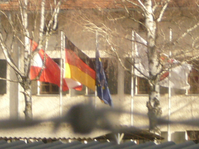 Ich hatte seinerzeit (25.3.2010) das Thema schon bei der Kleinen Zeitung angesprochen. Da gab es eine Rubrik „die Leser fragen, die Kleine antwortet". Die brachte die Antwort des Sprechers des Landeskommandos, der meinte es wären Manöver in Österreich, an denen einige Länder teilnehmen würden. Daher diverse Uniformen, keine Erwähnung der Fahne. Die Manöver sind seit 15 Jahren vorbei, die Fahne weht noch immer.