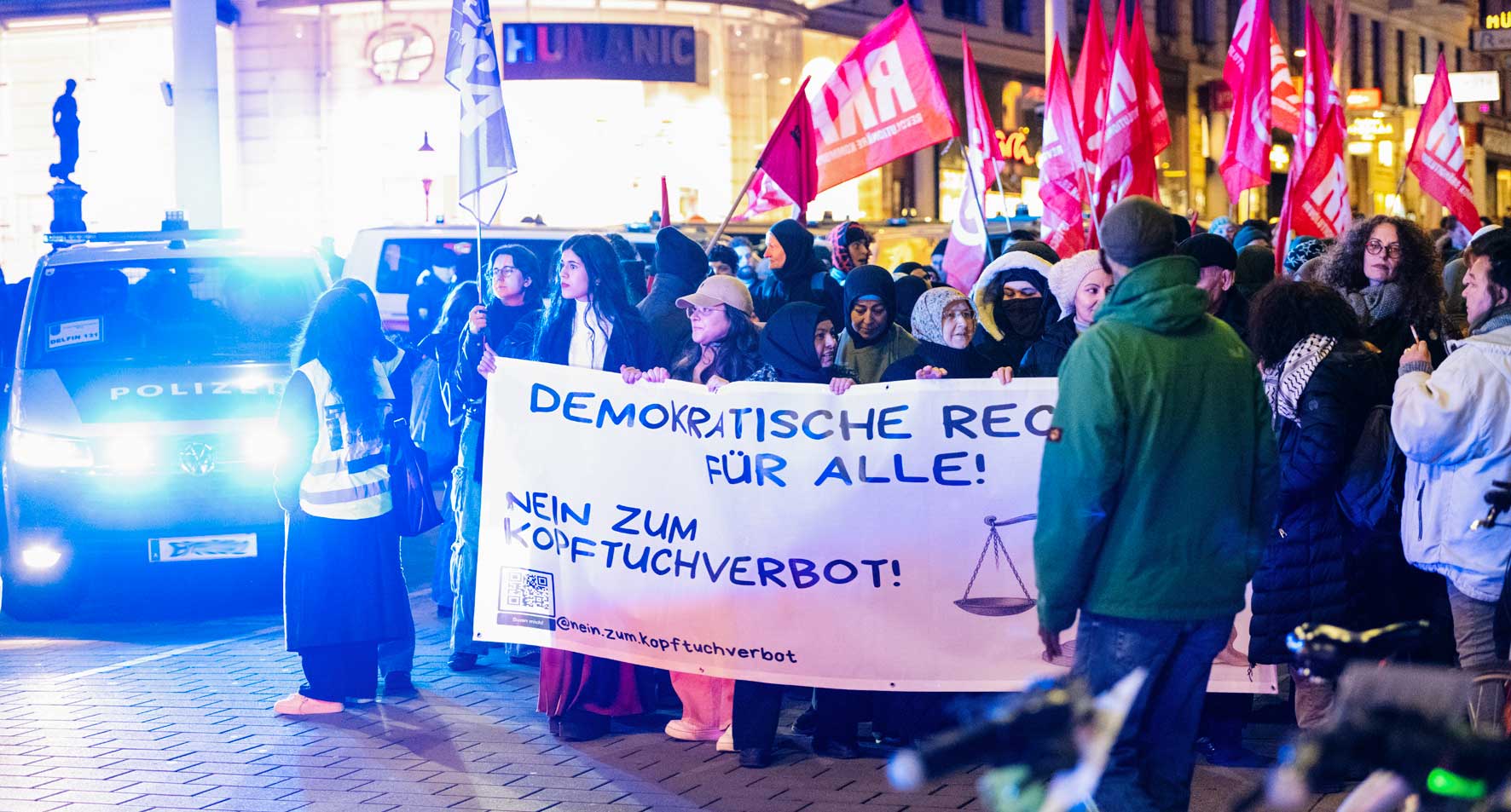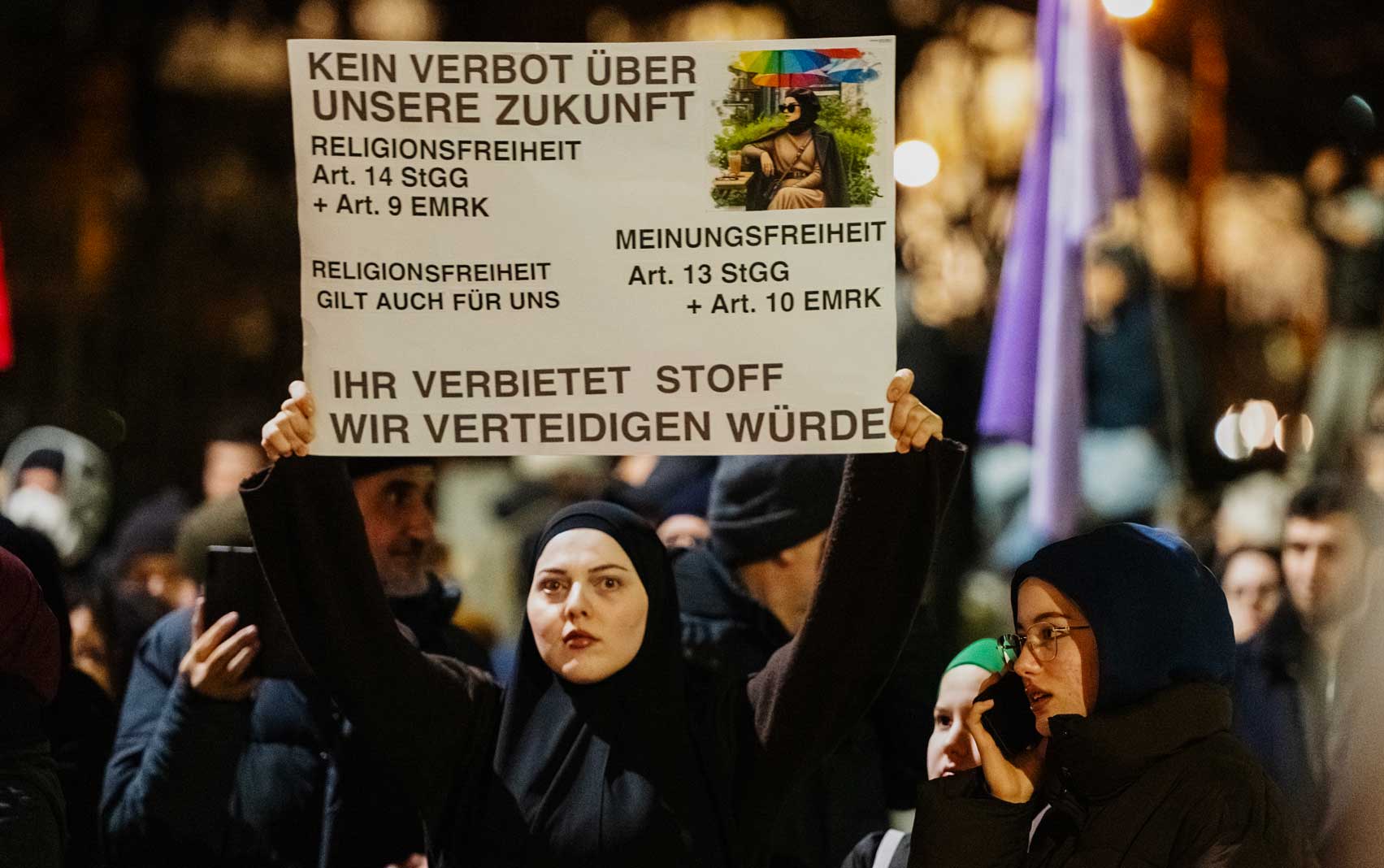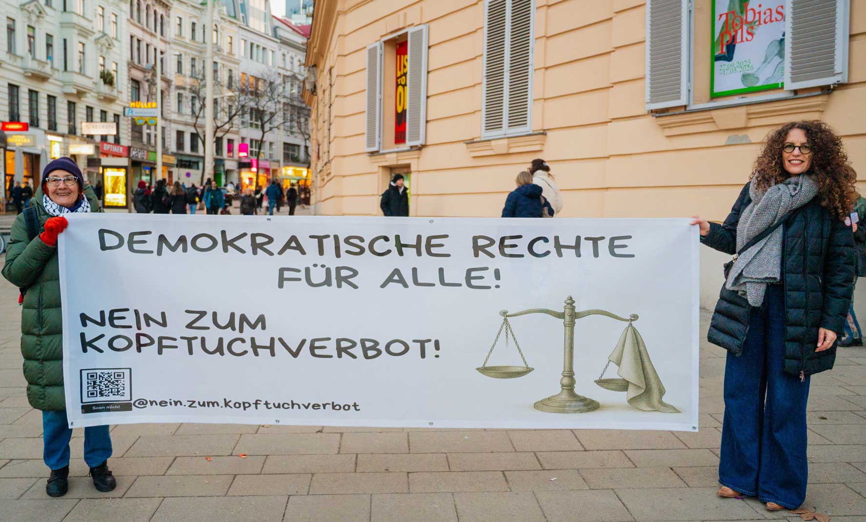 Unter dem gemeinsamen Motto „Demokratische Rechte für alle – Nein zum Kopftuchverbot“ demonstrierten vergangenen Freitag 13.2. rund 800 Menschen gegen das im Parlament beschlossene Kopftuchverbot. Dieses soll schrittweise mit dem laufenden Schulsemester in Kraft treten.