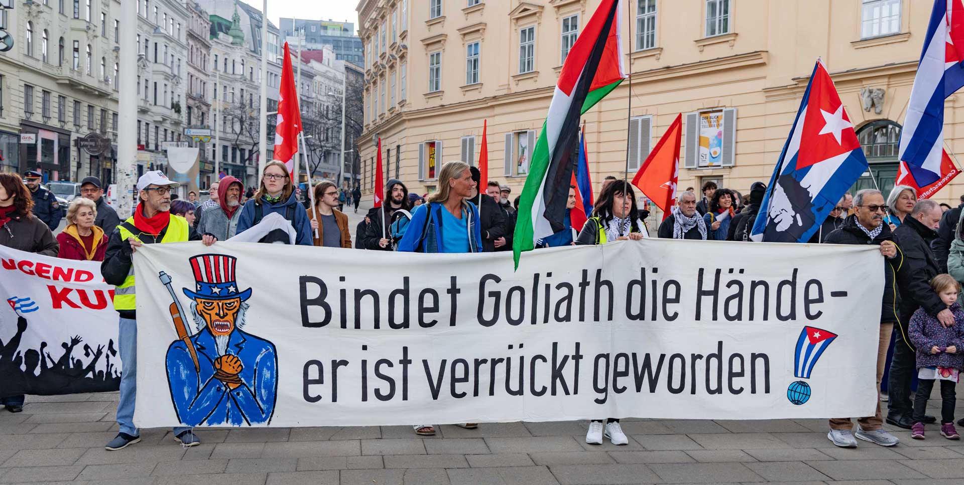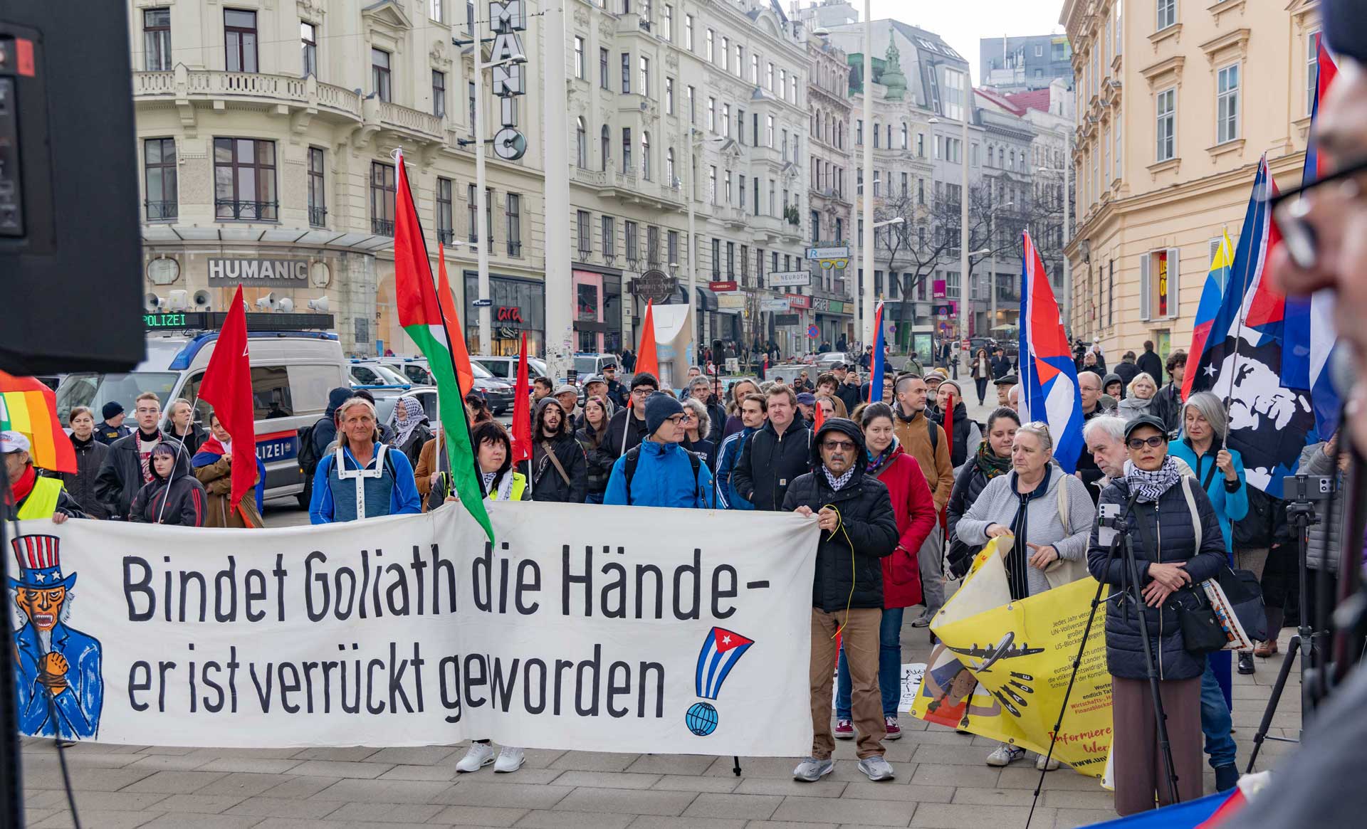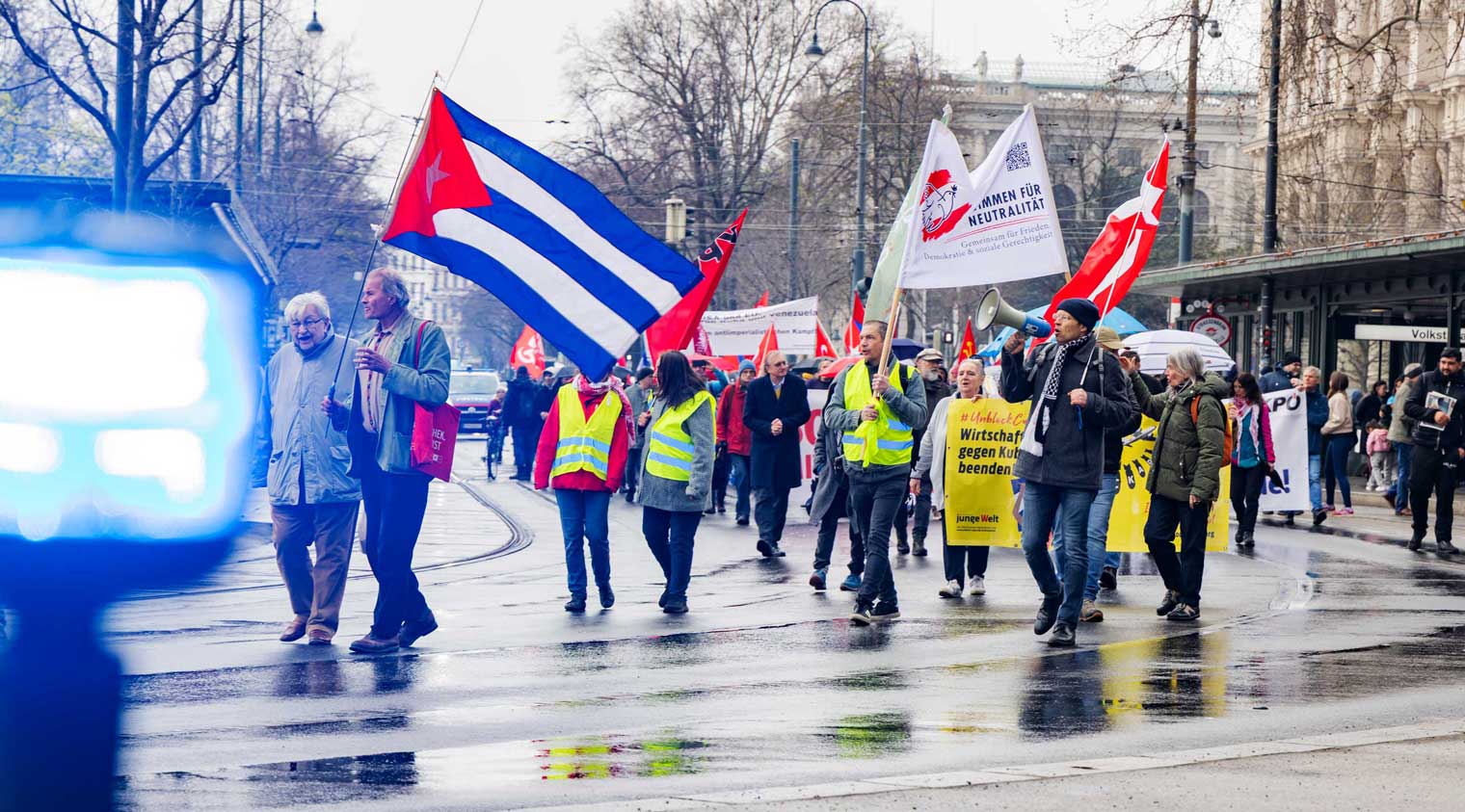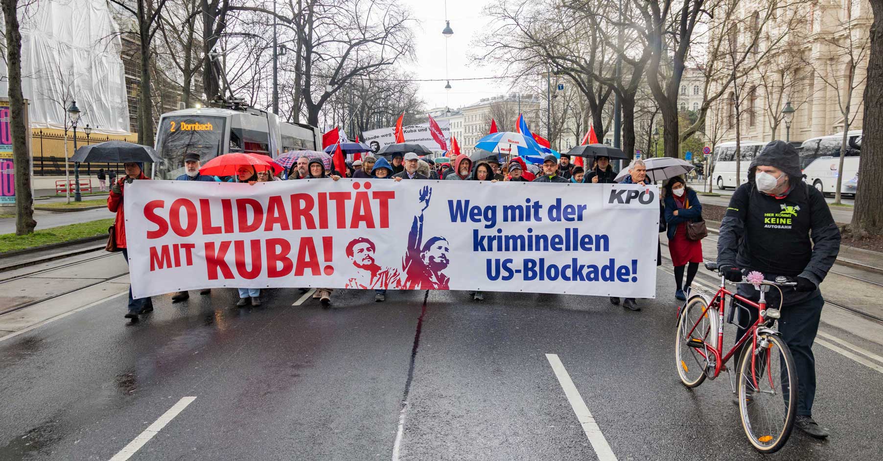 Die Demo war organisiert von der Österreichisch Kubanischen Gesellschaft gemeinsam mit dem Bündnis Stimmen für Neutralität, unterstützt von mehr al einem Dutzend unterschiedlicher Organisationen. Zahlreiche Rednerinnen und Redner drückten die Bandbreite der Mobilisierung aus.