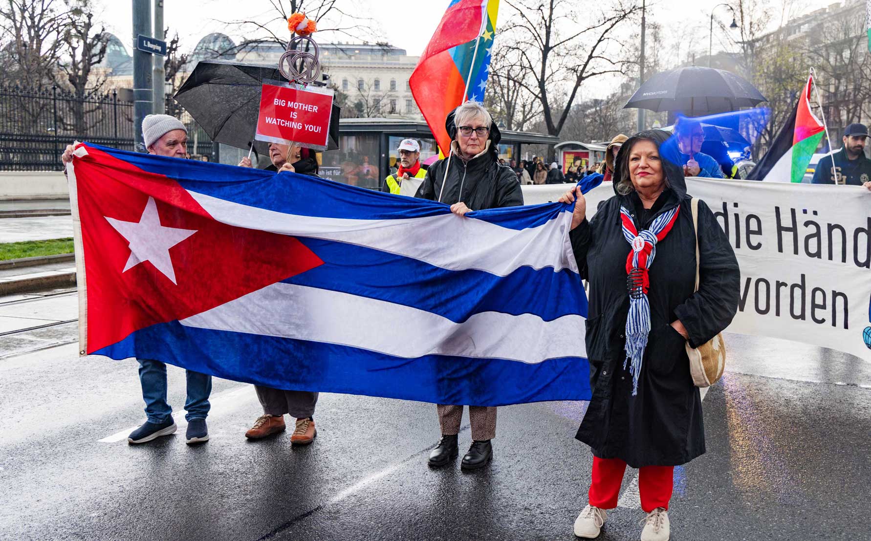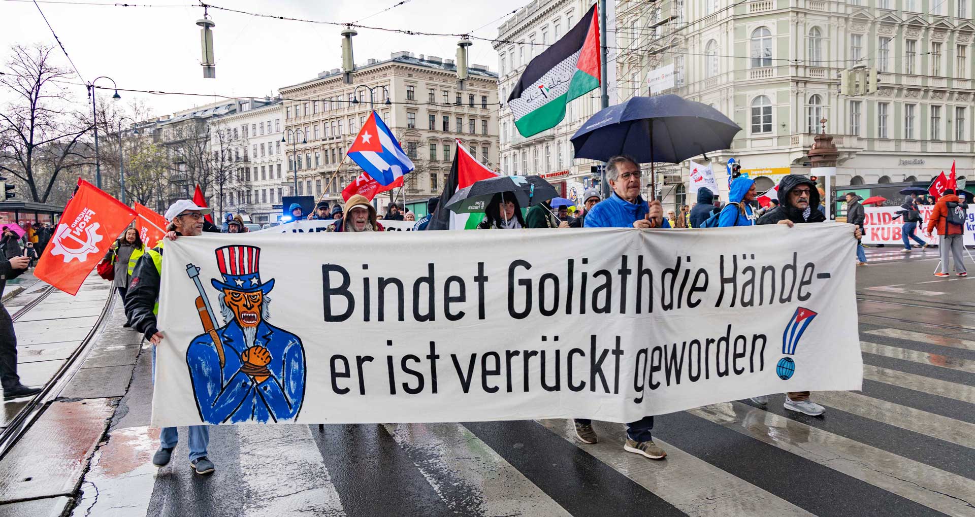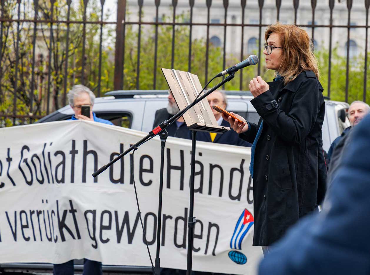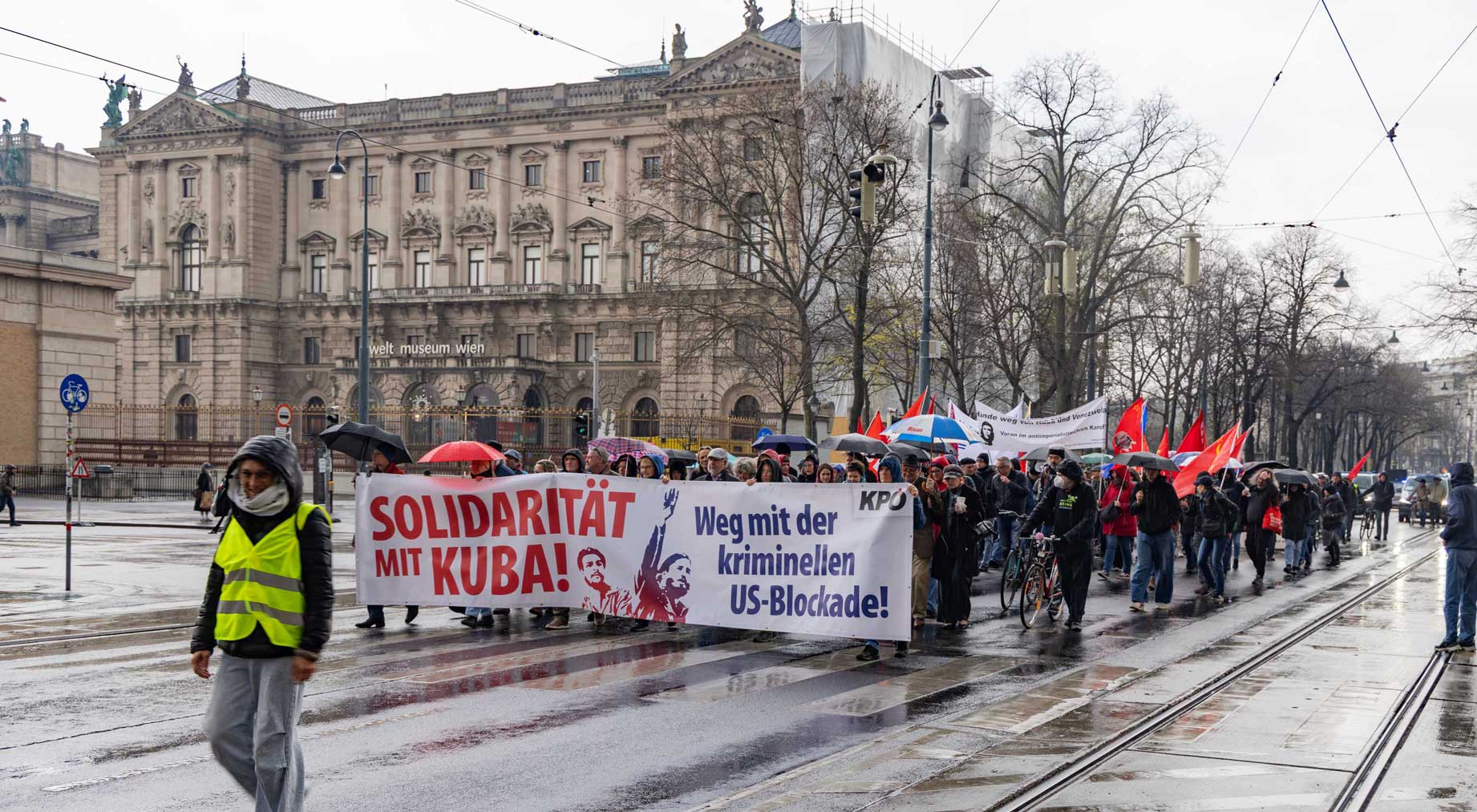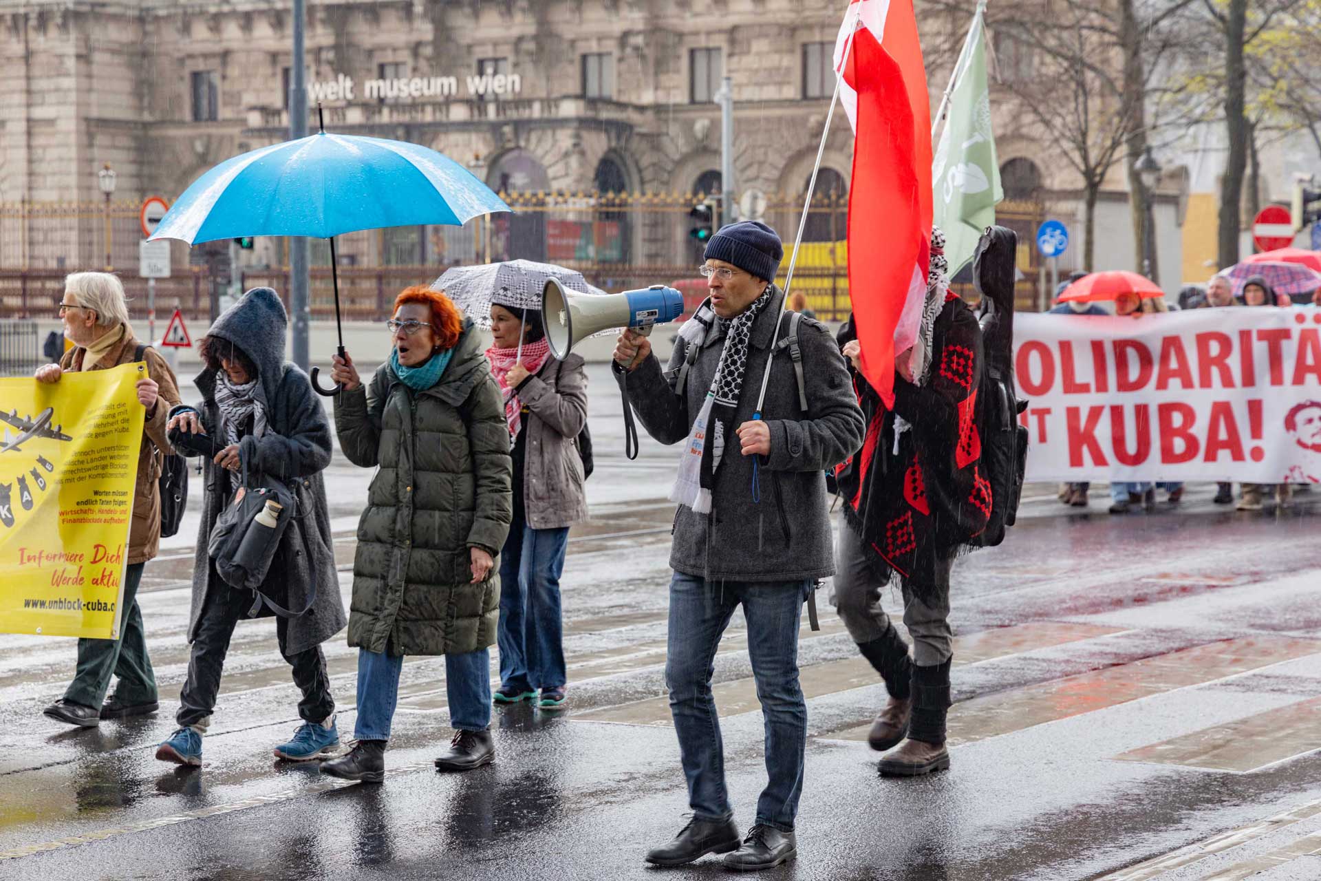 Die Demo war organisiert von der Österreichisch Kubanischen Gesellschaft gemeinsam mit dem Bündnis Stimmen für Neutralität, unterstützt von mehr al einem Dutzend unterschiedlicher Organisationen. Zahlreiche Rednerinnen und Redner drückten die Bandbreite der Mobilisierung aus.