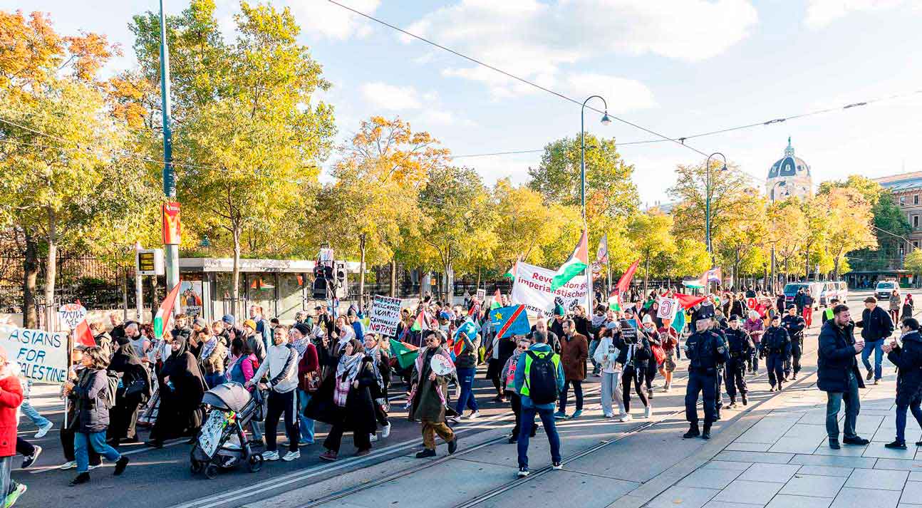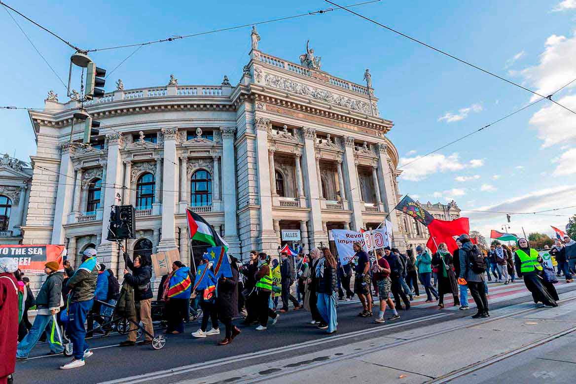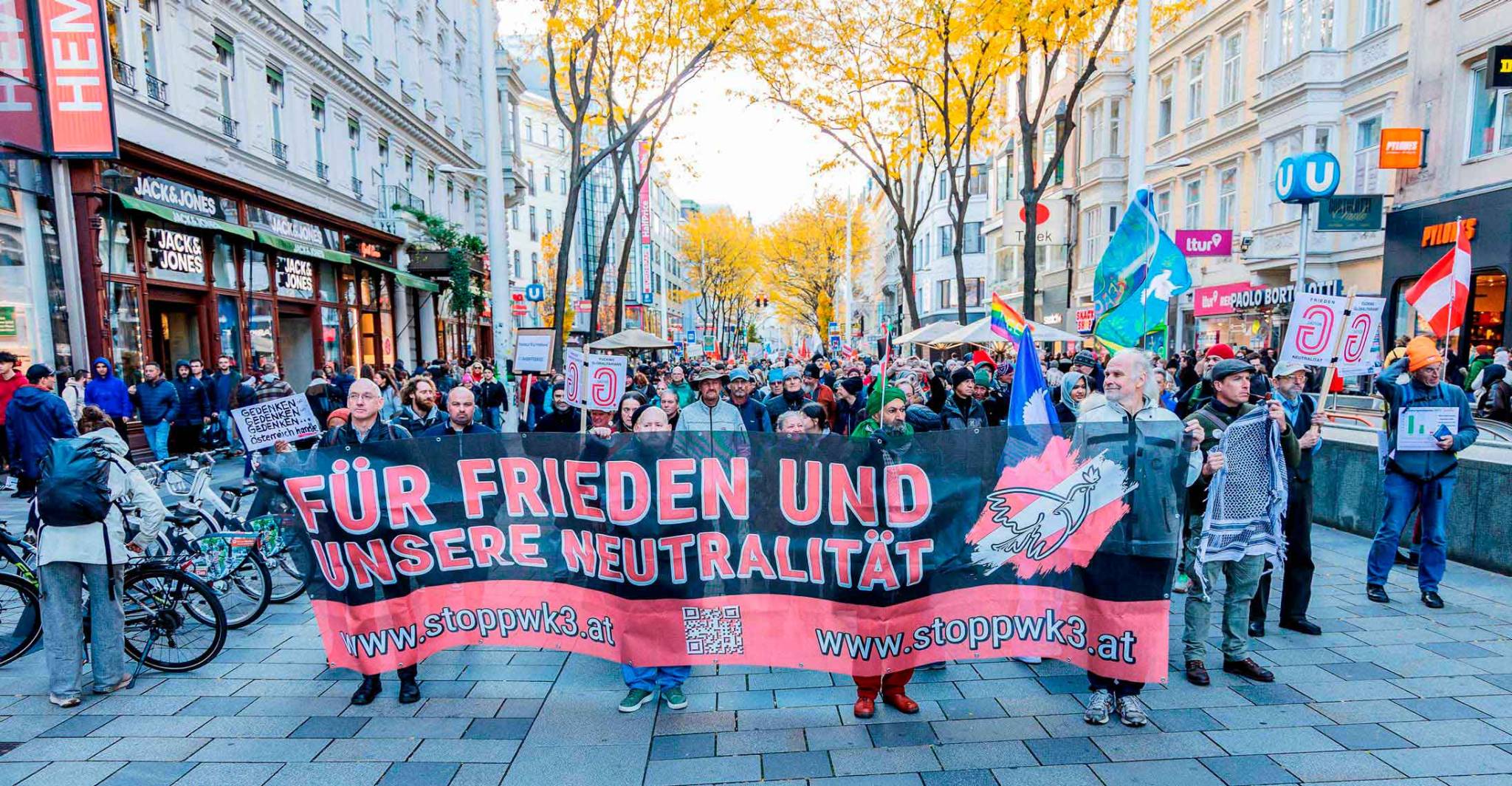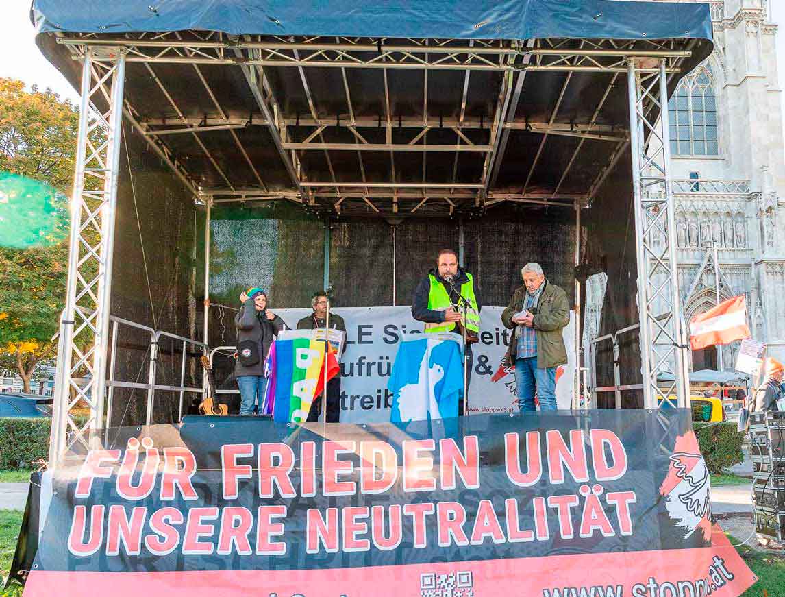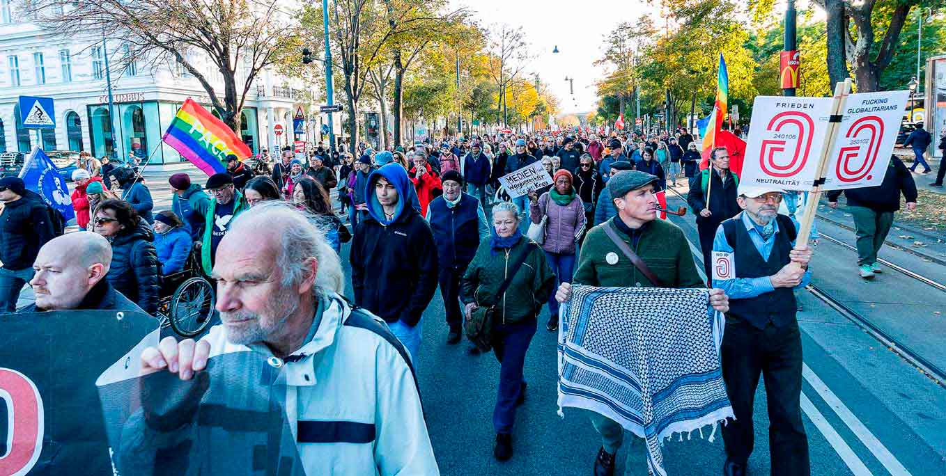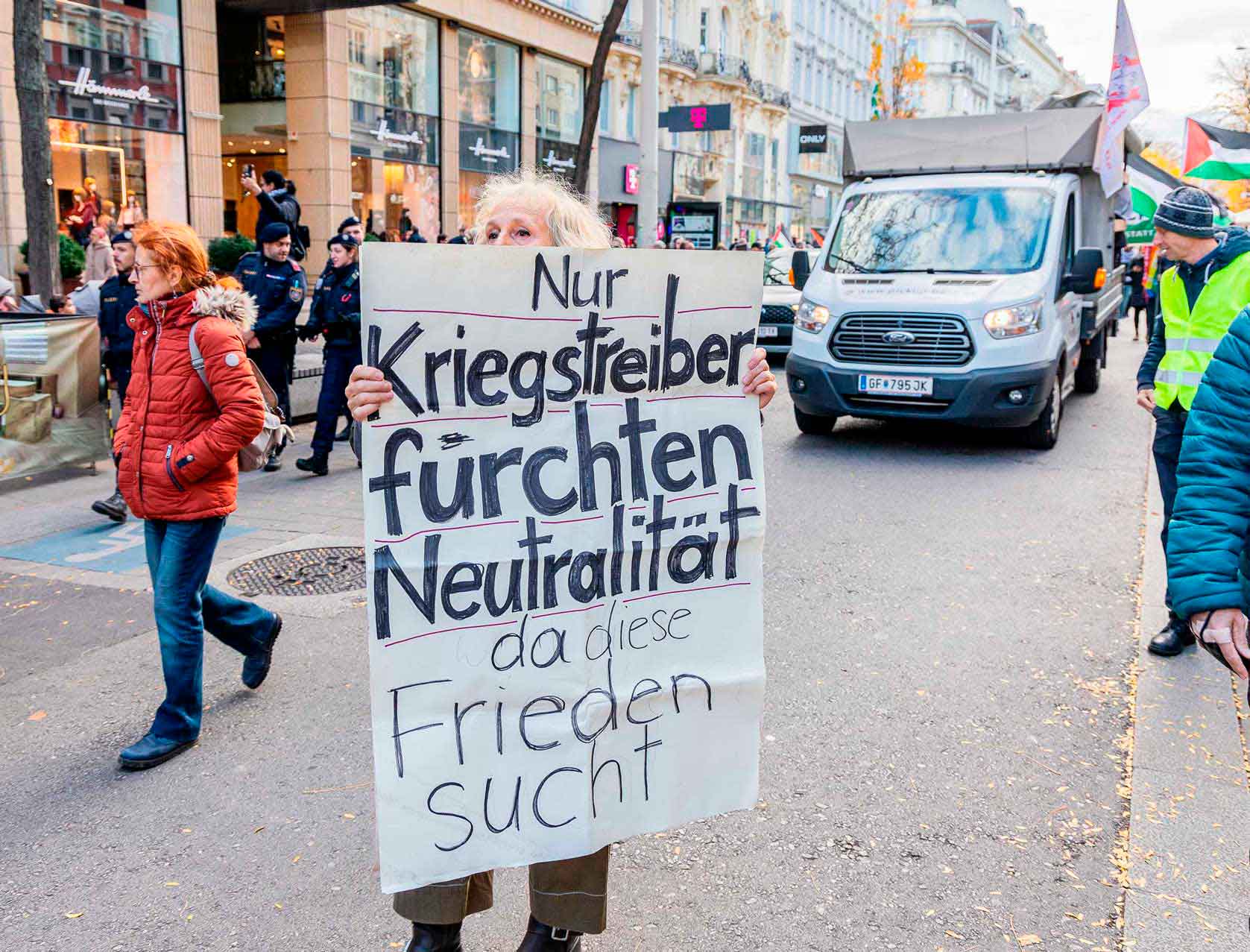 Um ca. 13:30 Uhr hielten die Ersten Ihre Ansprachen am Christian Broda Platz. Um ca. 14:15 Uhr brachen die gesamten Teilnehmer der Demo auf um sich auf der Mariahilfer Straße lautstark für Frieden, Neutralität und Souveränität einzusetzen. Der Gesamt Demo-Zug wurde angeführt von einem großen Block aus den unterschiedlichsten politischen Lagern, die sich geeint haben gegen die Kriegshetze des Establishments. Weiter hinten war ein weiterer Block, angeführt von einem Pritschenwagen, fanden sich dort die internationalen Teilnehmer der Demo, welche auch eine große Gruppe von Palästina-Solidarischen umfasste. Am Ende der Mariahilfer Straße umfasste der Demozug ca. 3.000 Teilnehmer, ein sehr beachtlicher Erfolg für die sperrigen Themen "Frieden und Neutralität", die geflissentlich vom Mainstream umgedeutet oder ignoriert werden.