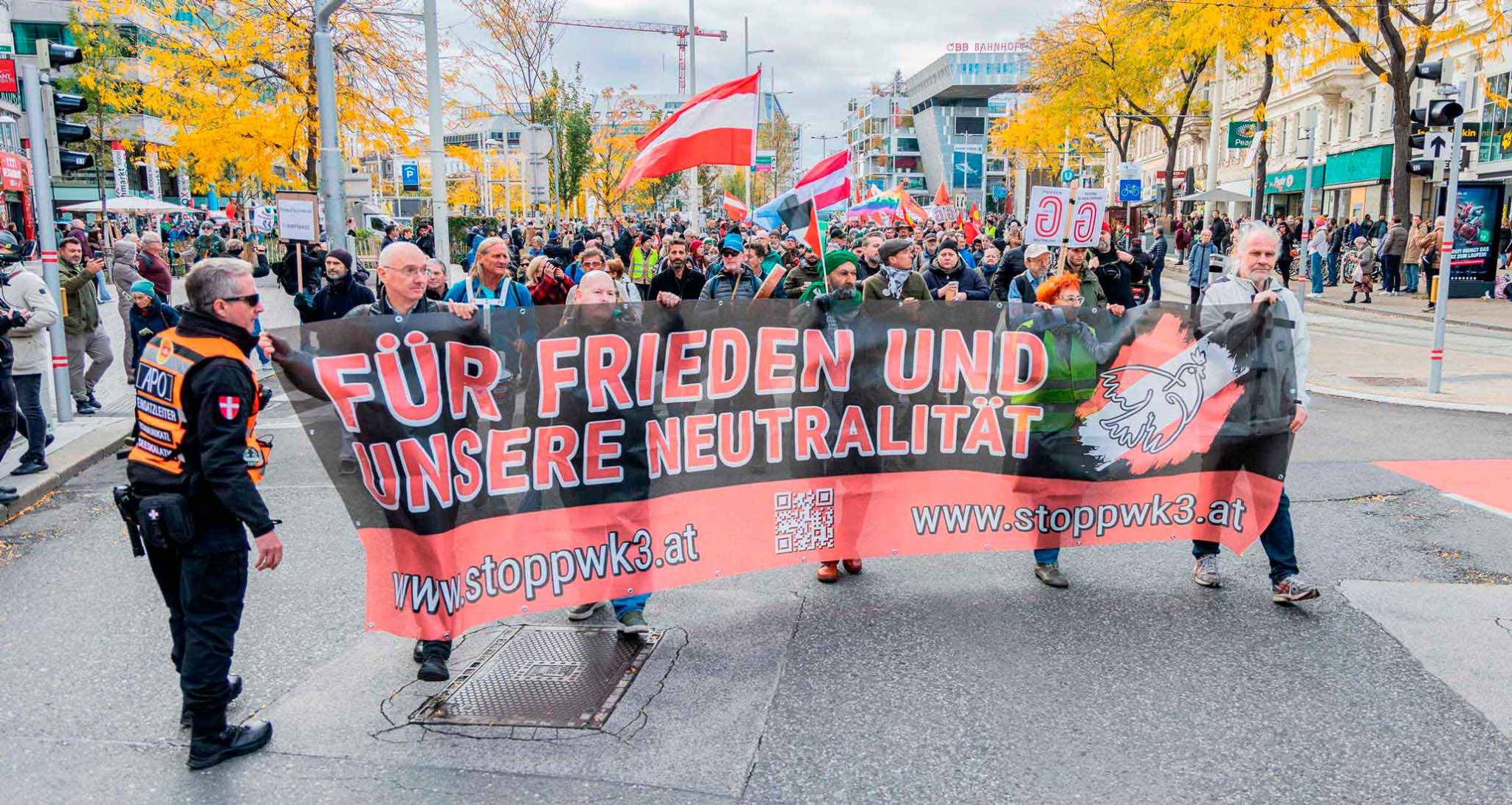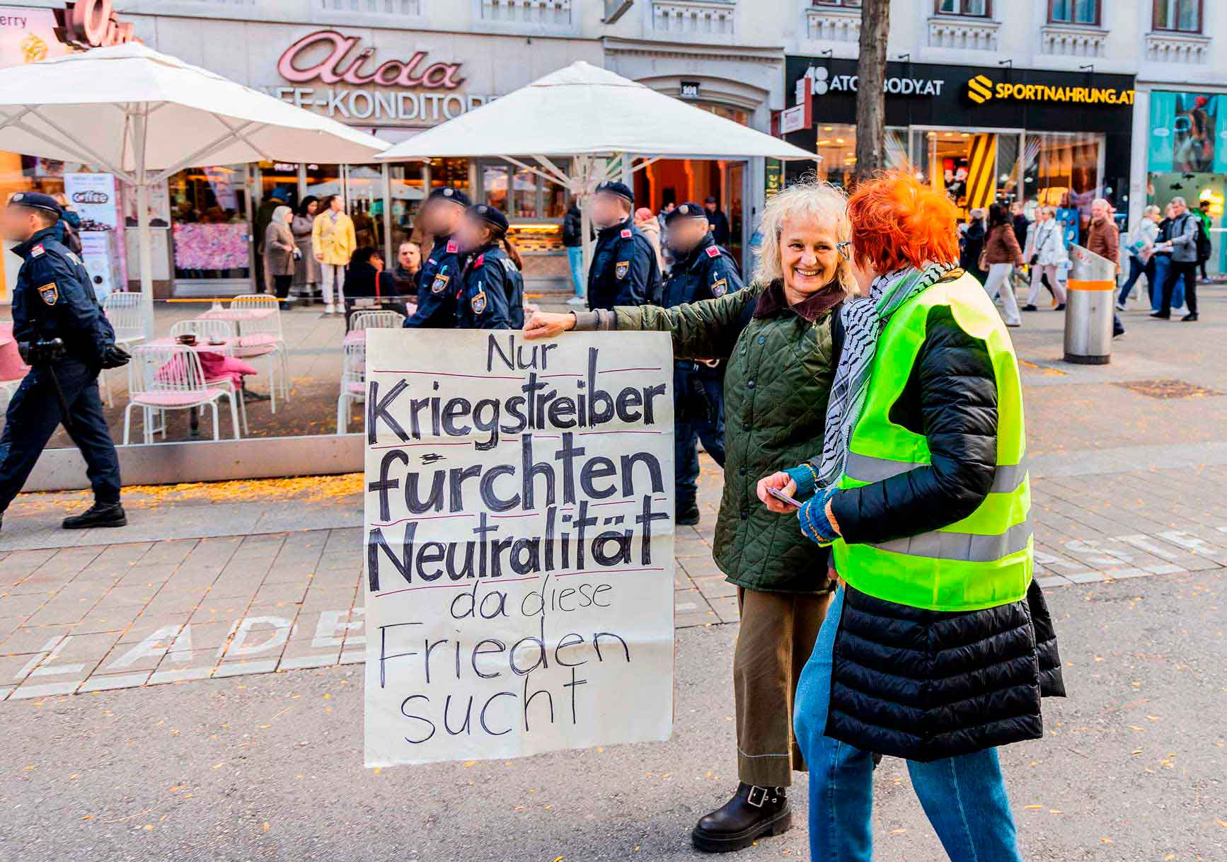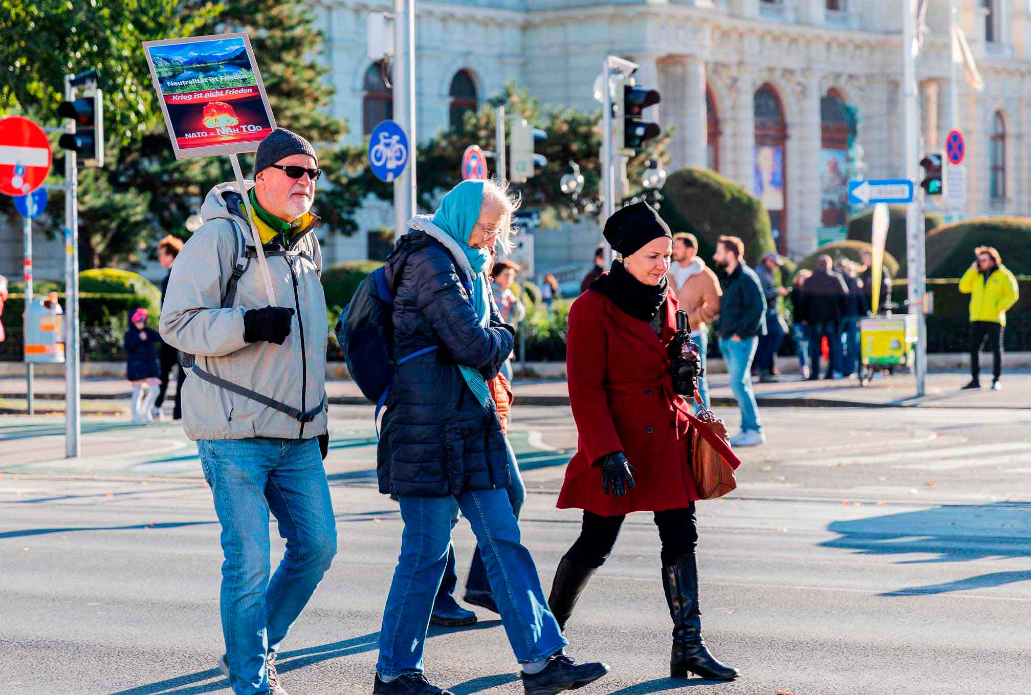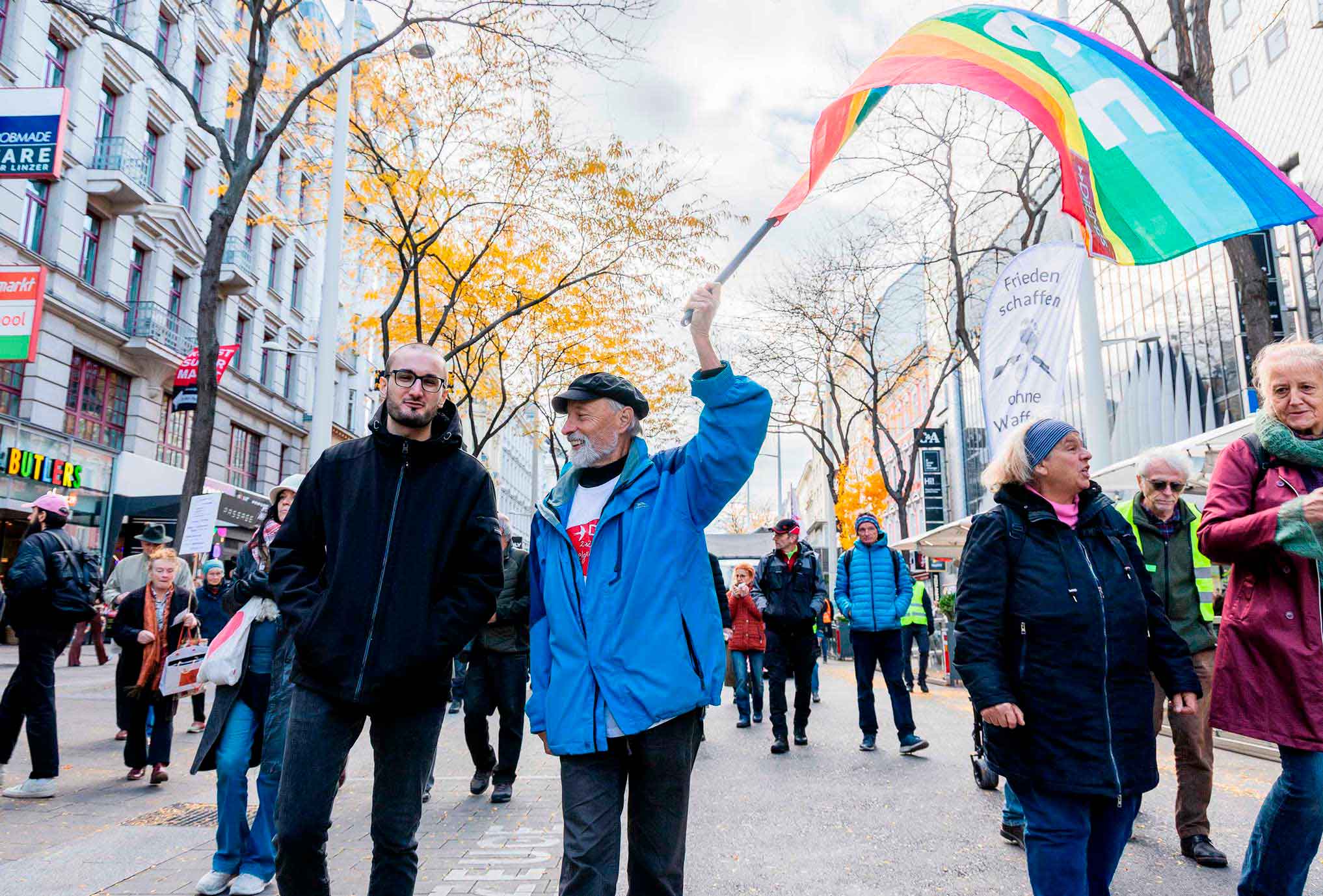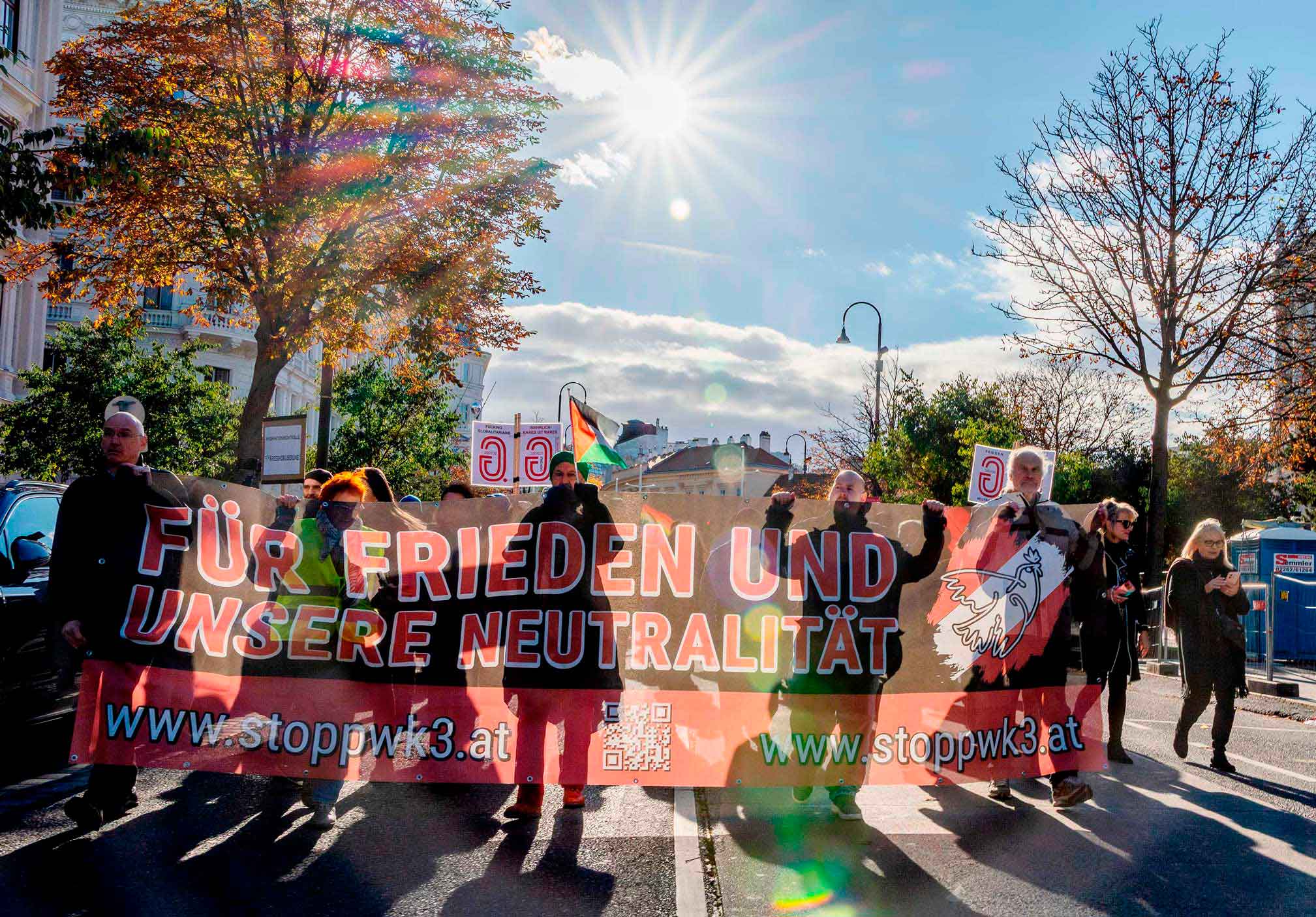 Um ca. 13:30 Uhr hielten die Ersten Ihre Ansprachen am Christian Broda Platz. Um ca. 14:15 Uhr brachen die gesamten Teilnehmer der Demo auf um sich auf der Mariahilfer Straße lautstark für Frieden, Neutralität und Souveränität einzusetzen. Der Gesamt Demo-Zug wurde angeführt von einem großen Block aus den unterschiedlichsten politischen Lagern, die sich geeint haben gegen die Kriegshetze des Establishments. Weiter hinten war ein weiterer Block, angeführt von einem Pritschenwagen, fanden sich dort die internationalen Teilnehmer der Demo, welche auch eine große Gruppe von Palästina-Solidarischen umfasste. Am Ende der Mariahilfer Straße umfasste der Demozug ca. 3.000 Teilnehmer, ein sehr beachtlicher Erfolg für die sperrigen Themen "Frieden und Neutralität", die geflissentlich vom Mainstream umgedeutet oder ignoriert werden.