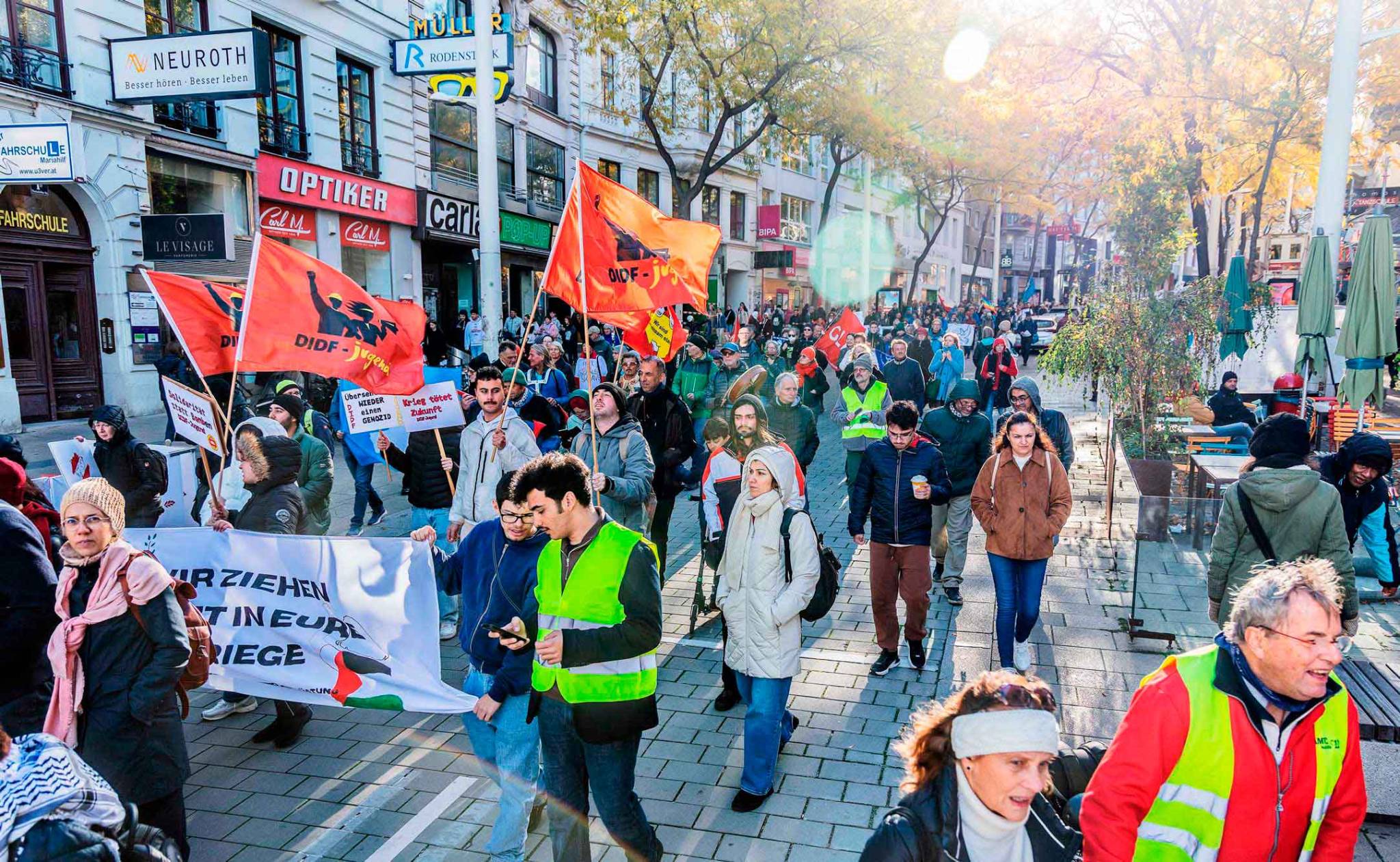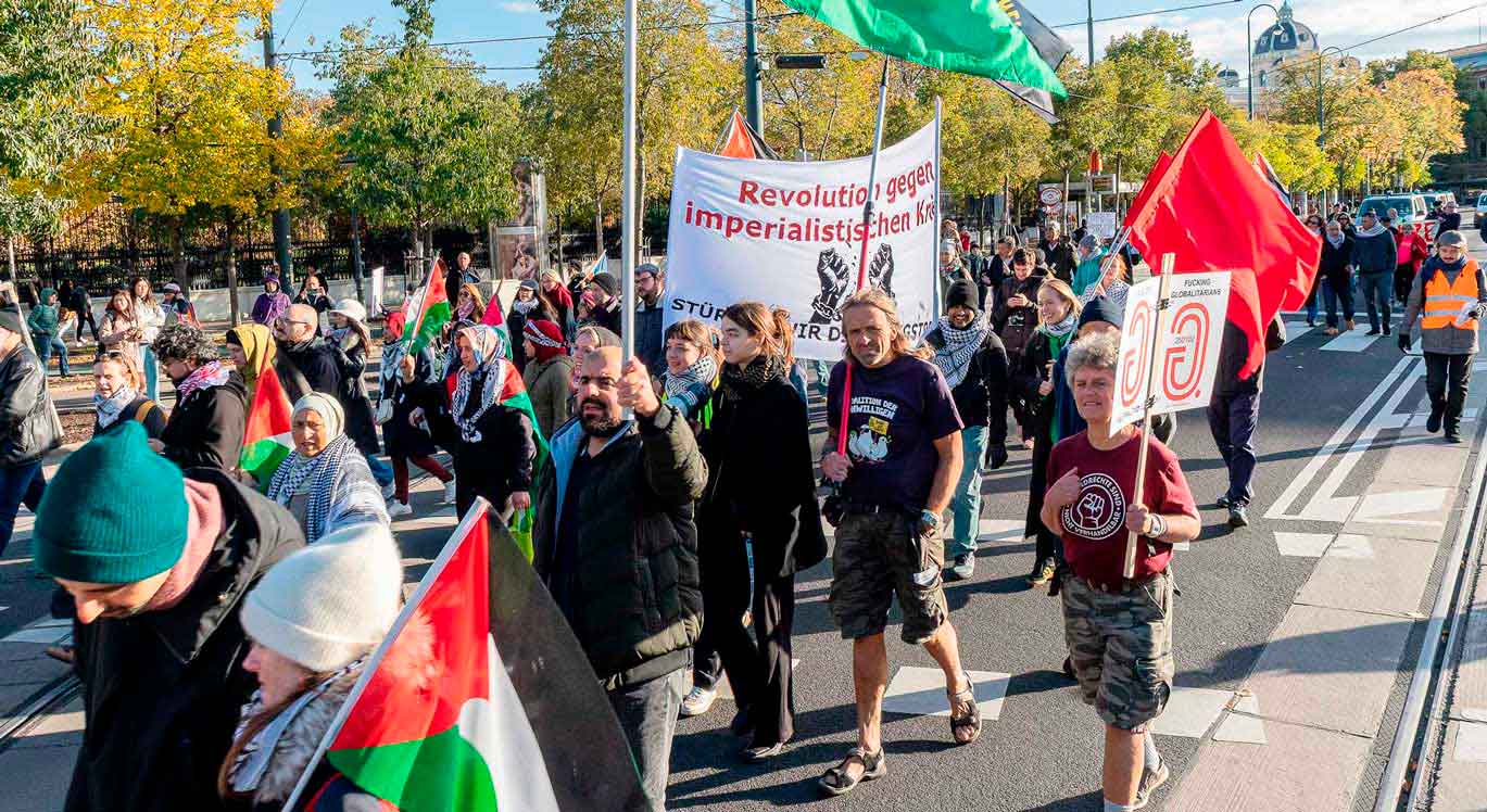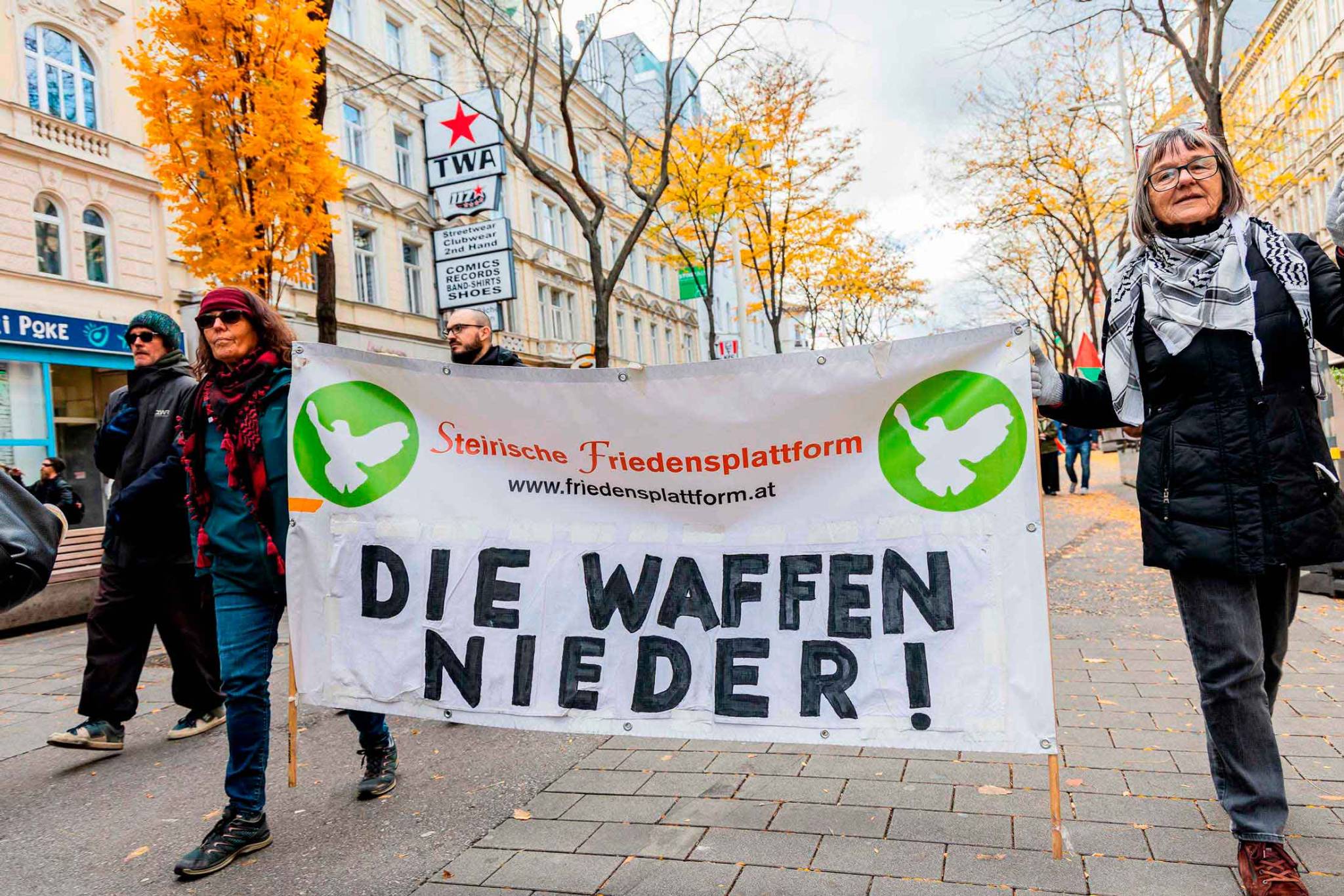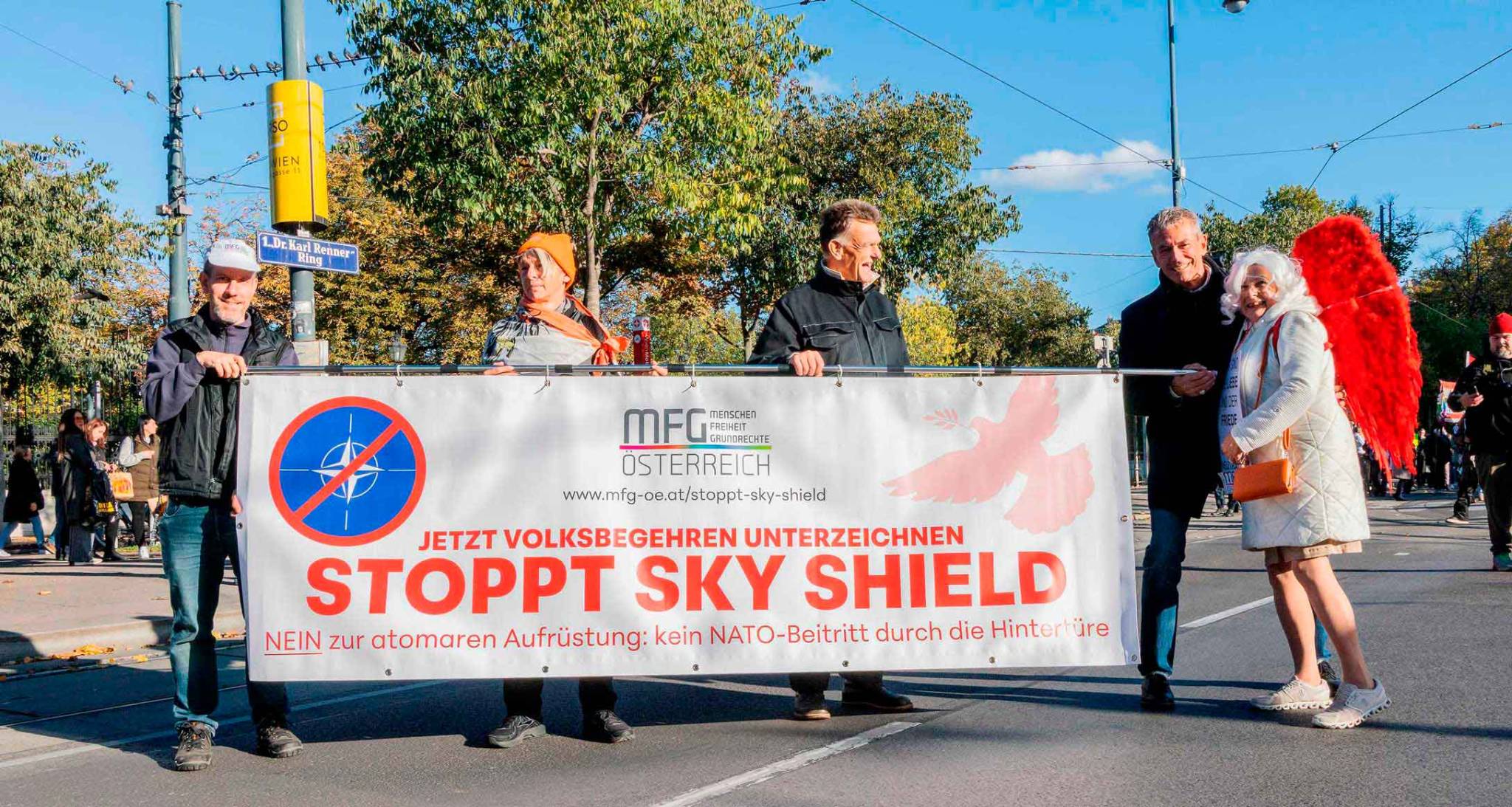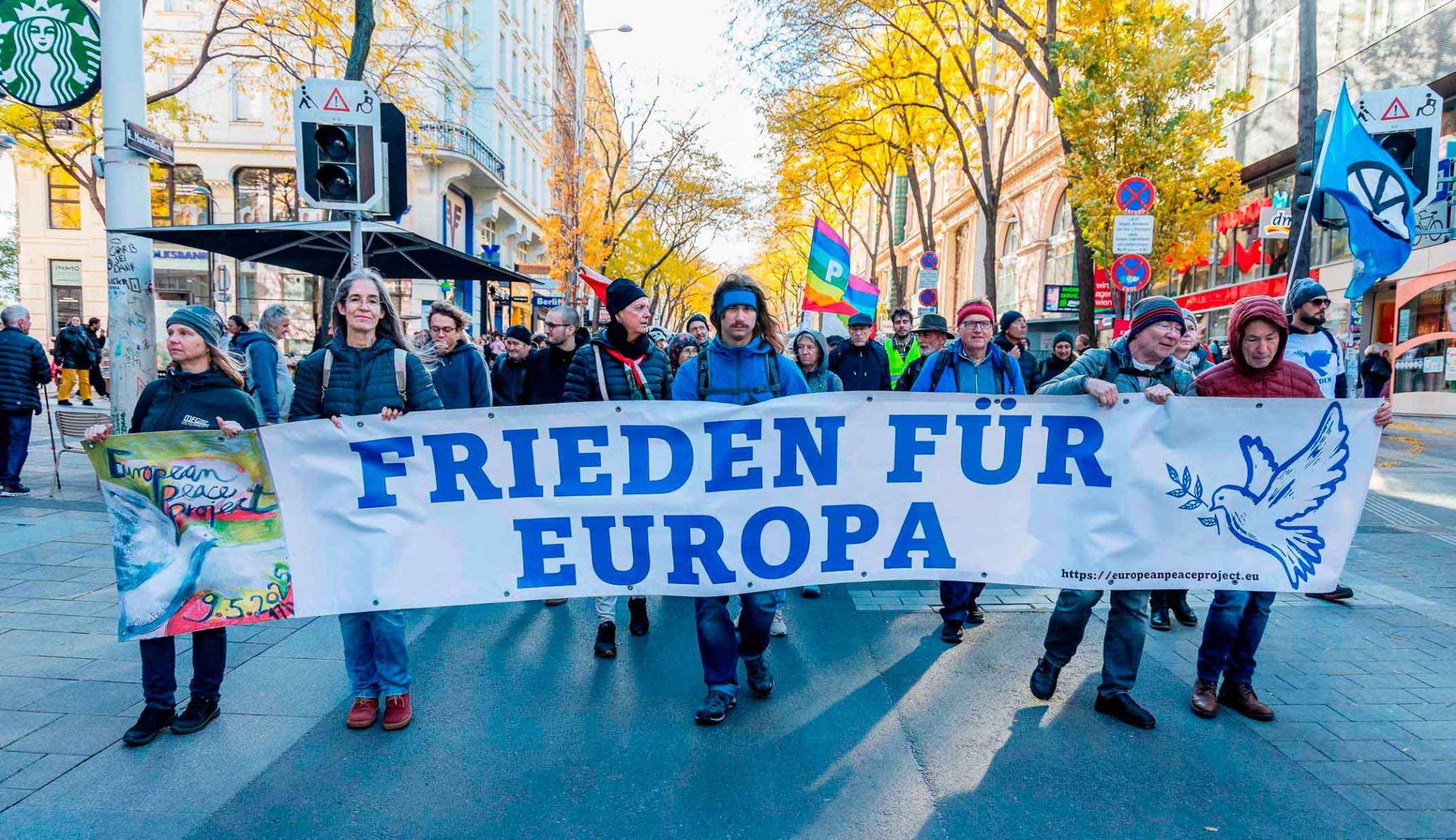 Um ca. 13:30 Uhr hielten die Ersten Ihre Ansprachen am Christian Broda Platz. Um ca. 14:15 Uhr brachen die gesamten Teilnehmer der Demo auf um sich auf der Mariahilfer Straße lautstark für Frieden, Neutralität und Souveränität einzusetzen. Der Gesamt Demo-Zug wurde angeführt von einem großen Block aus den unterschiedlichsten politischen Lagern, die sich geeint haben gegen die Kriegshetze des Establishments. Weiter hinten war ein weiterer Block, angeführt von einem Pritschenwagen, fanden sich dort die internationalen Teilnehmer der Demo, welche auch eine große Gruppe von Palästina-Solidarischen umfasste. Am Ende der Mariahilfer Straße umfasste der Demozug ca. 3.000 Teilnehmer, ein sehr beachtlicher Erfolg für die sperrigen Themen "Frieden und Neutralität", die geflissentlich vom Mainstream umgedeutet oder ignoriert werden.