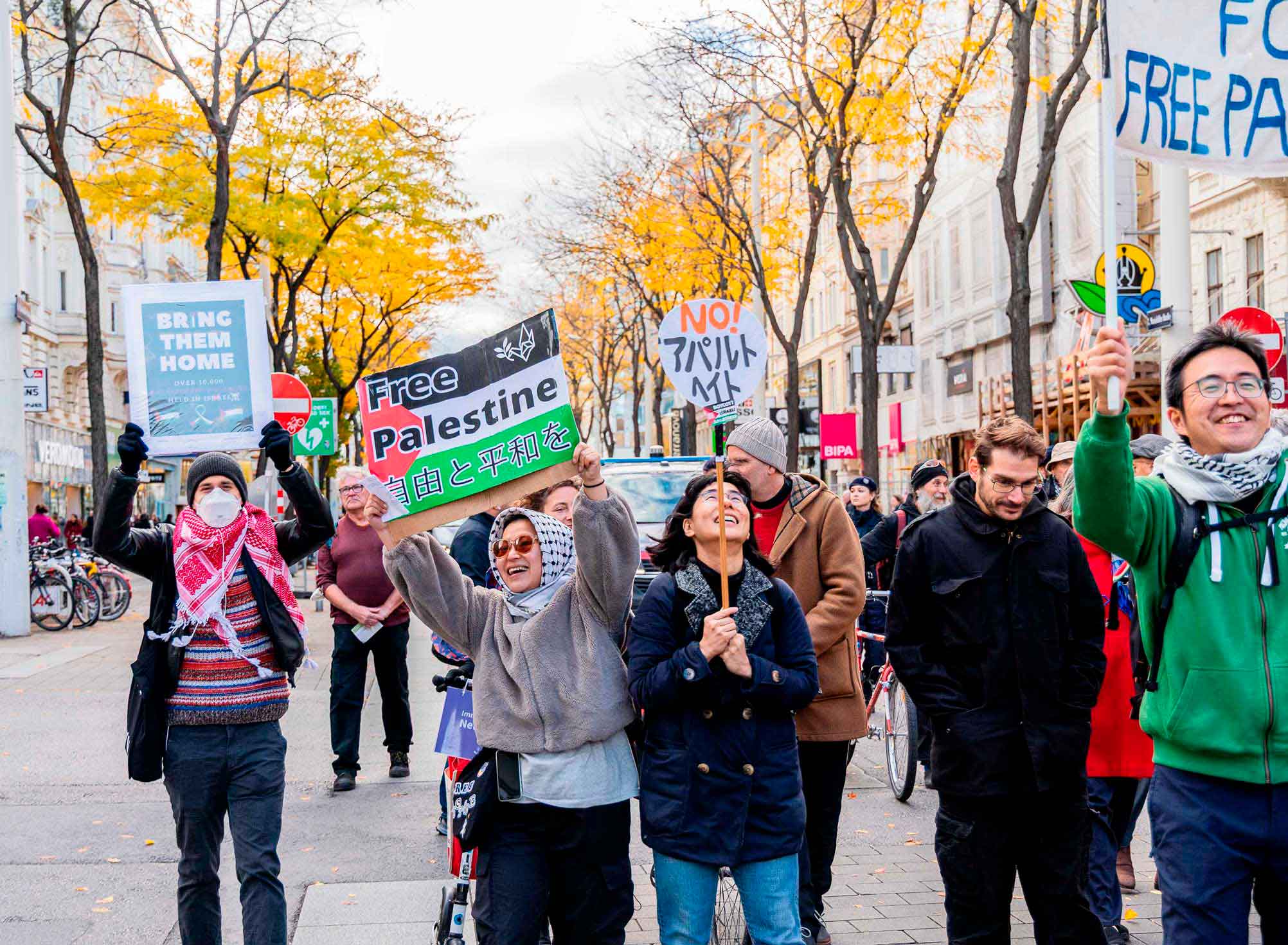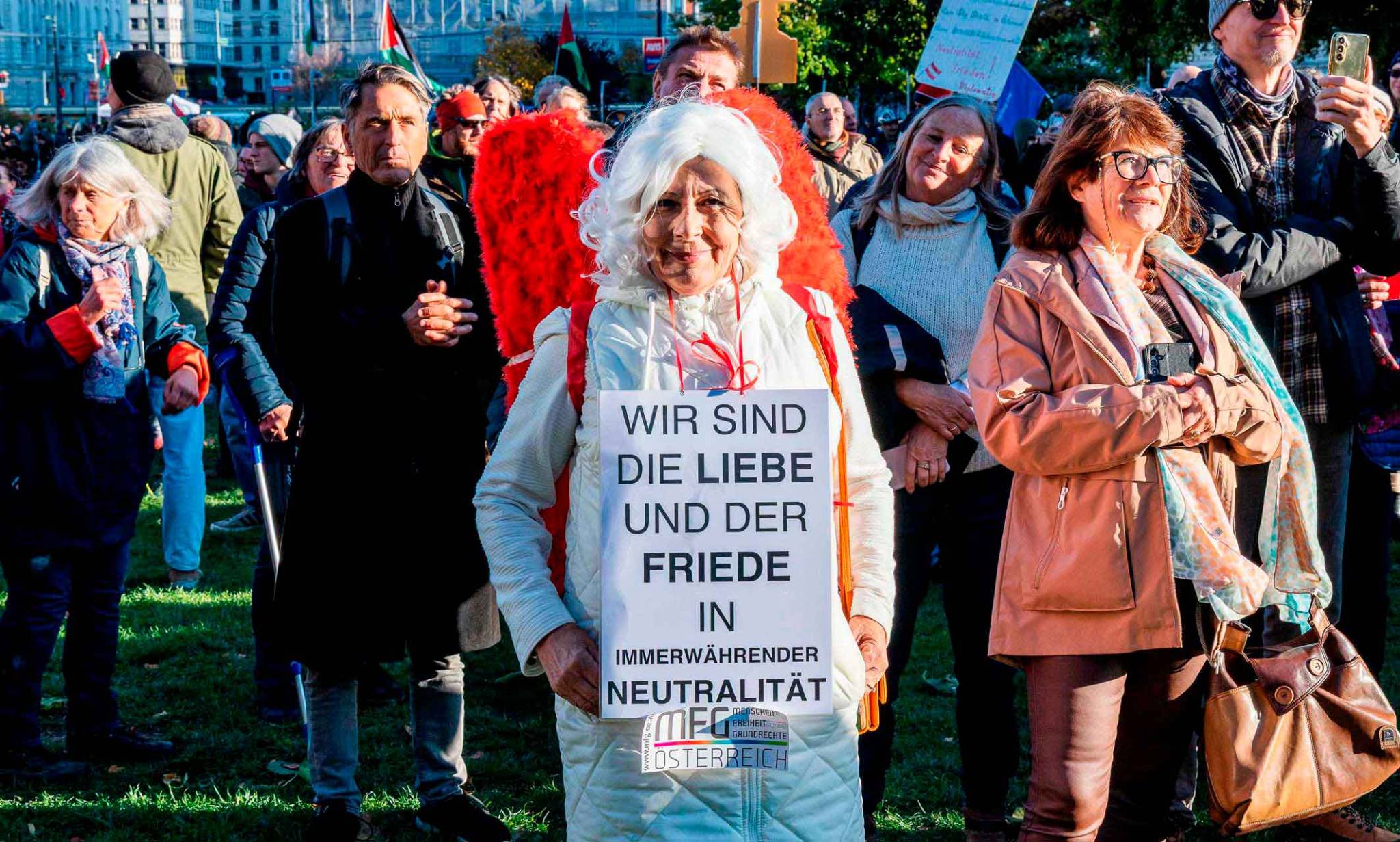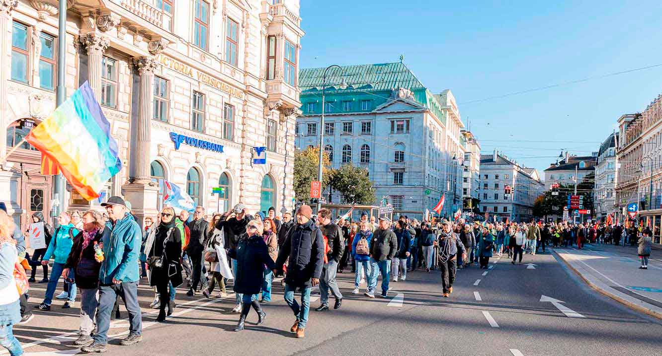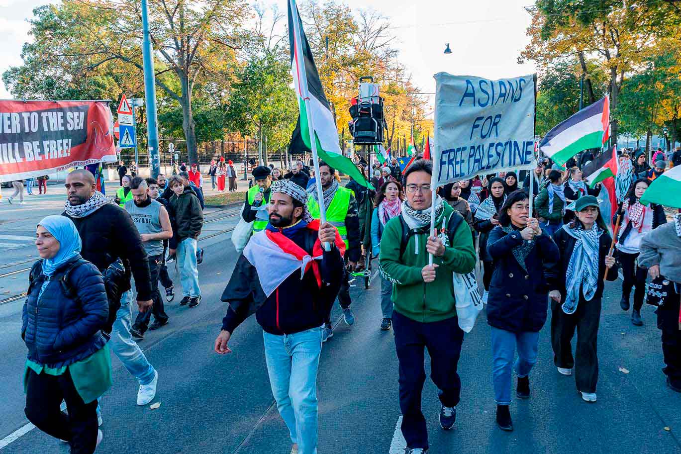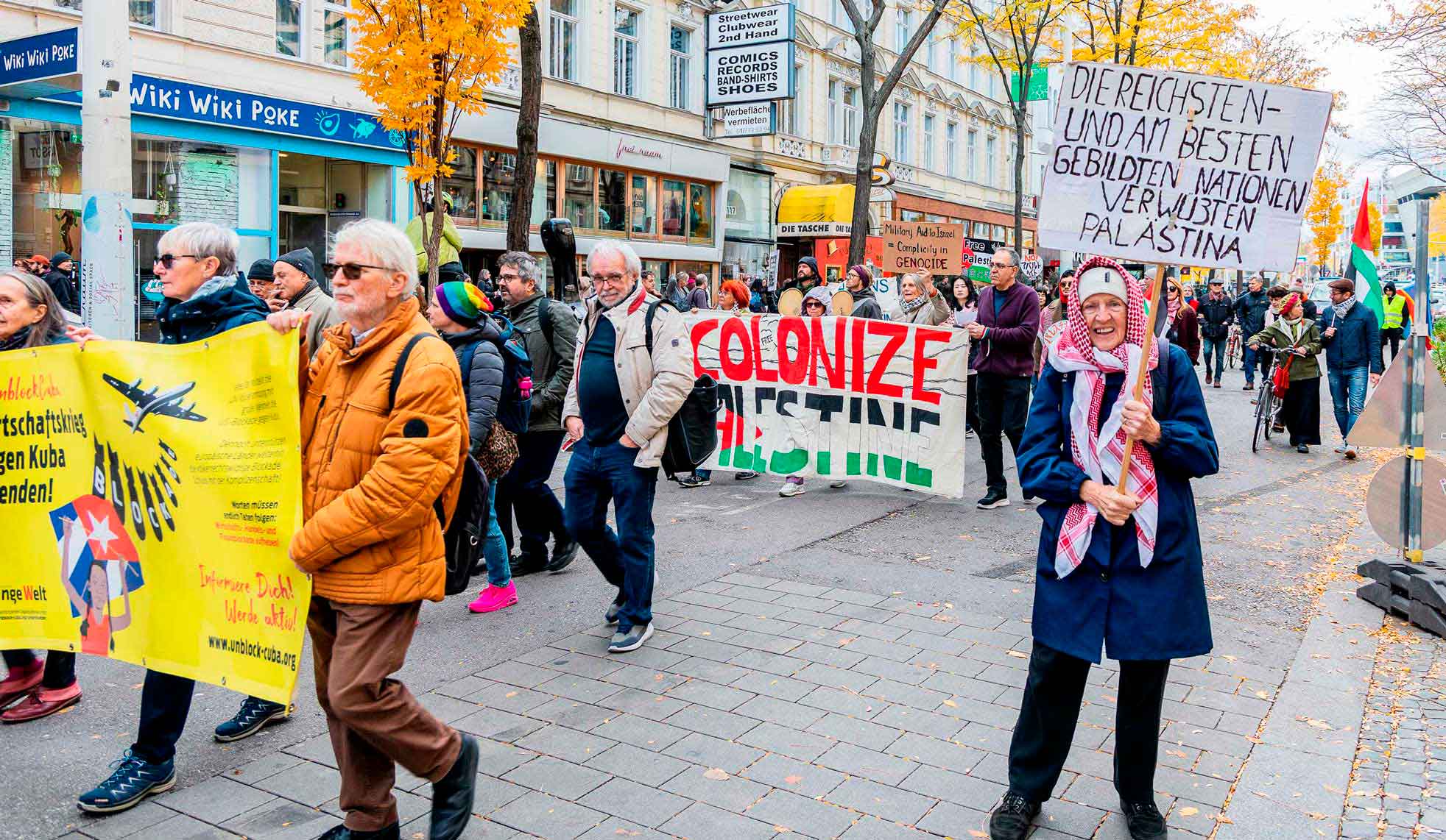 Um ca. 13:30 Uhr hielten die Ersten Ihre Ansprachen am Christian Broda Platz. Um ca. 14:15 Uhr brachen die gesamten Teilnehmer der Demo auf um sich auf der Mariahilfer Straße lautstark für Frieden, Neutralität und Souveränität einzusetzen. Der Gesamt Demo-Zug wurde angeführt von einem großen Block aus den unterschiedlichsten politischen Lagern, die sich geeint haben gegen die Kriegshetze des Establishments. Weiter hinten war ein weiterer Block, angeführt von einem Pritschenwagen, fanden sich dort die internationalen Teilnehmer der Demo, welche auch eine große Gruppe von Palästina-Solidarischen umfasste. Am Ende der Mariahilfer Straße umfasste der Demozug ca. 3.000 Teilnehmer, ein sehr beachtlicher Erfolg für die sperrigen Themen "Frieden und Neutralität", die geflissentlich vom Mainstream umgedeutet oder ignoriert werden.