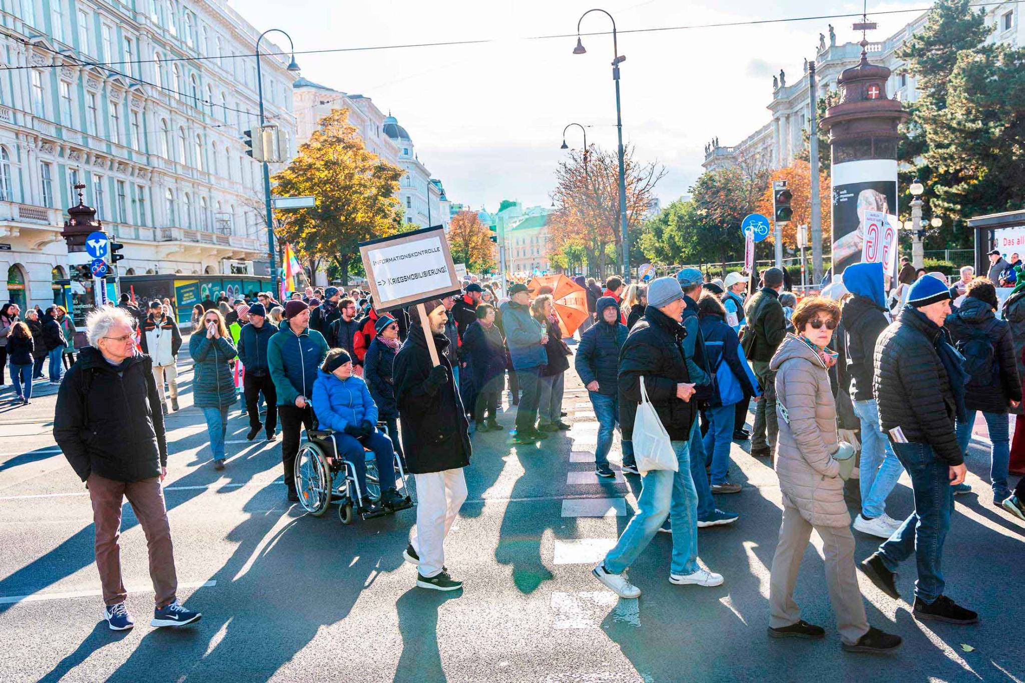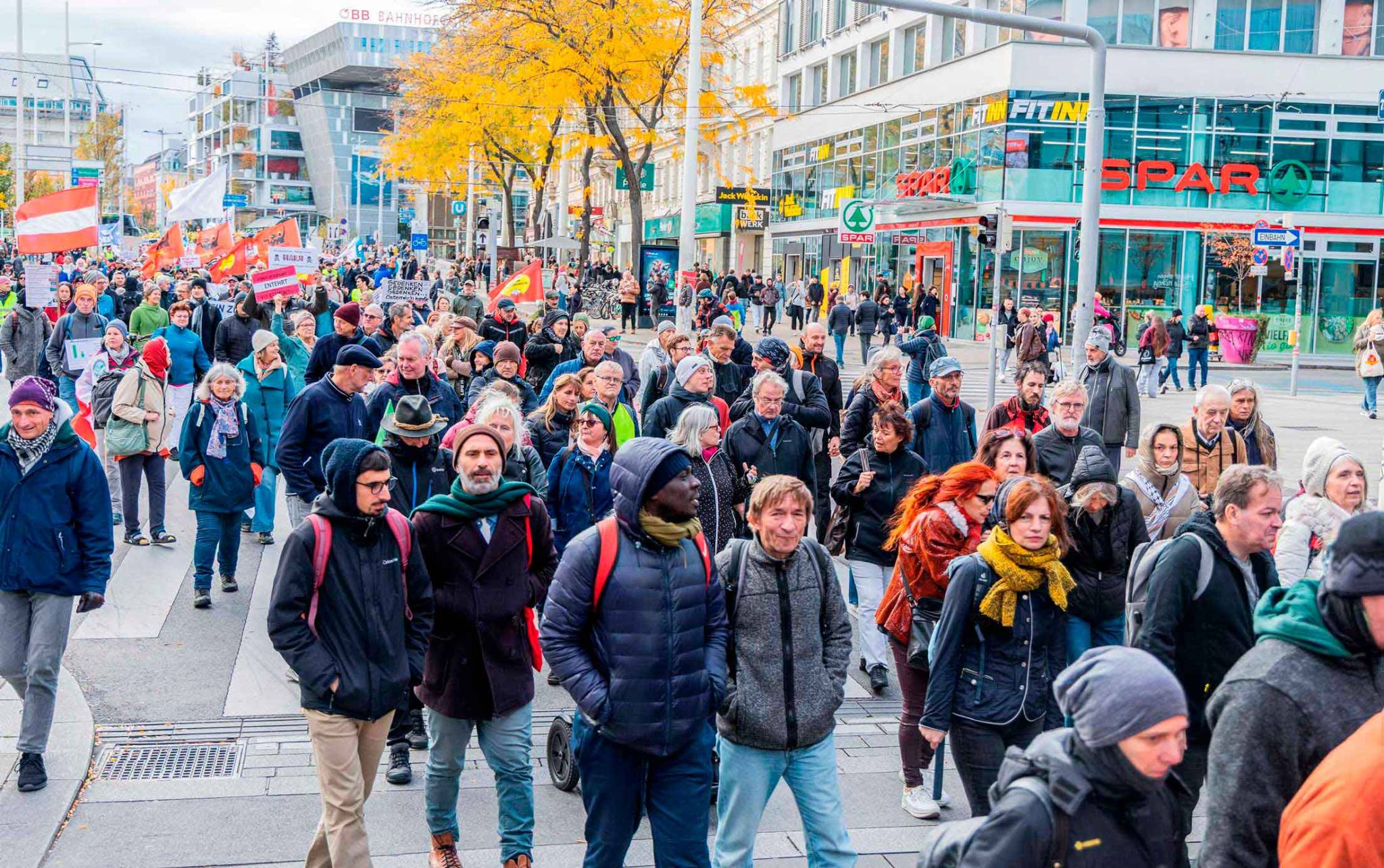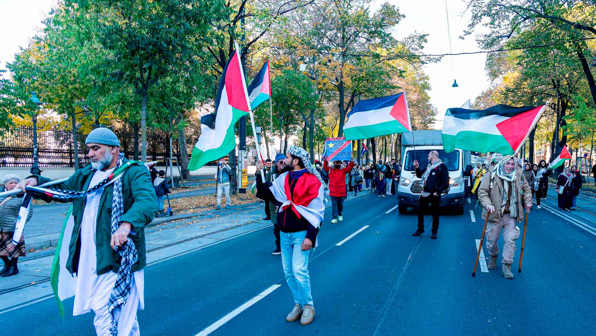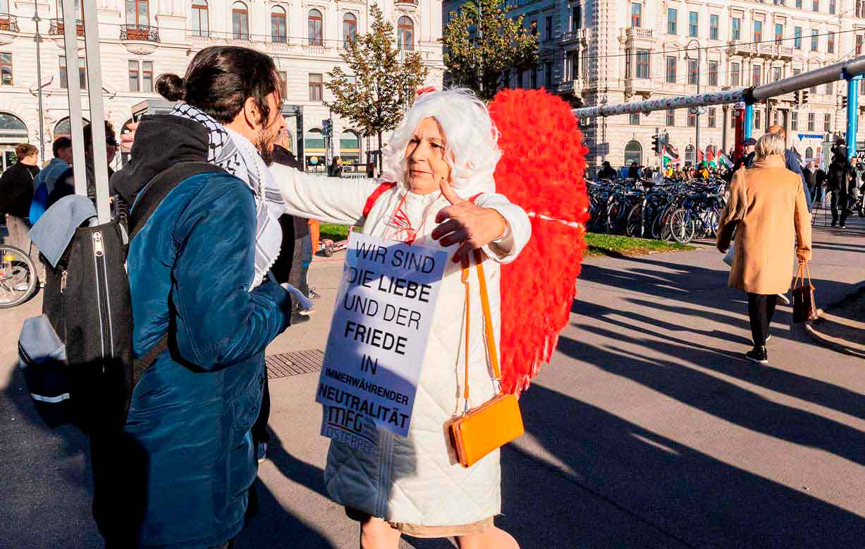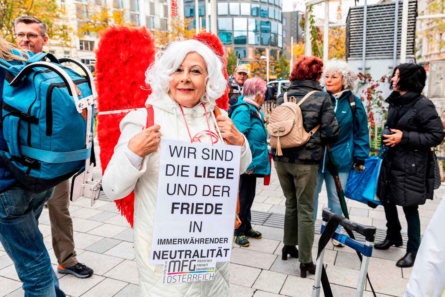 Um ca. 13:30 Uhr hielten die Ersten Ihre Ansprachen am Christian Broda Platz. Um ca. 14:15 Uhr brachen die gesamten Teilnehmer der Demo auf um sich auf der Mariahilfer Straße lautstark für Frieden, Neutralität und Souveränität einzusetzen. Der Gesamt Demo-Zug wurde angeführt von einem großen Block aus den unterschiedlichsten politischen Lagern, die sich geeint haben gegen die Kriegshetze des Establishments. Weiter hinten war ein weiterer Block, angeführt von einem Pritschenwagen, fanden sich dort die internationalen Teilnehmer der Demo, welche auch eine große Gruppe von Palästina-Solidarischen umfasste. Am Ende der Mariahilfer Straße umfasste der Demozug ca. 3.000 Teilnehmer, ein sehr beachtlicher Erfolg für die sperrigen Themen "Frieden und Neutralität", die geflissentlich vom Mainstream umgedeutet oder ignoriert werden.