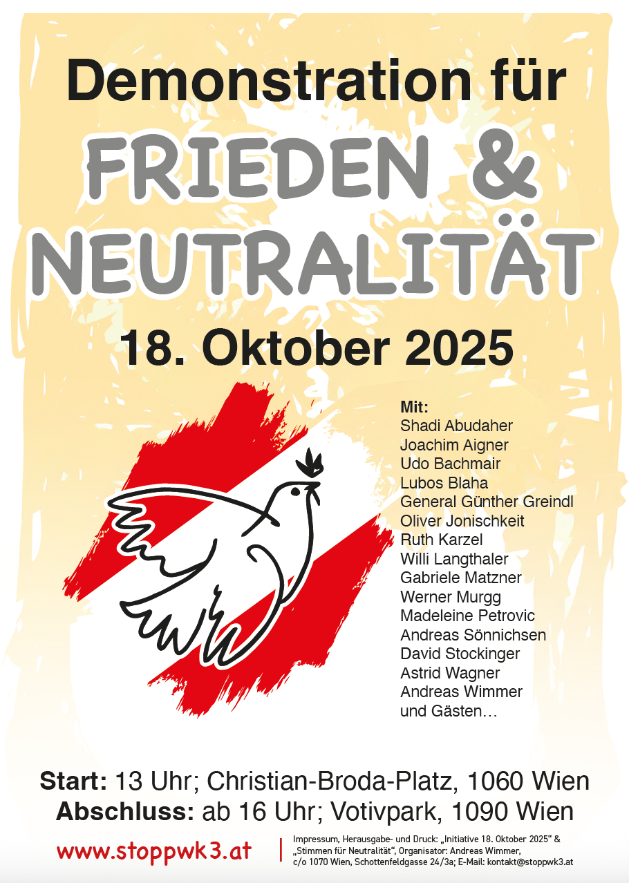 • GEGEN das – auch von Österreich – unterstützte 800 Milliarden EU-Rüstungsprogramm, GEGEN „Sky Shield“, GEGEN fremde Militärtransporte durch Österreich!