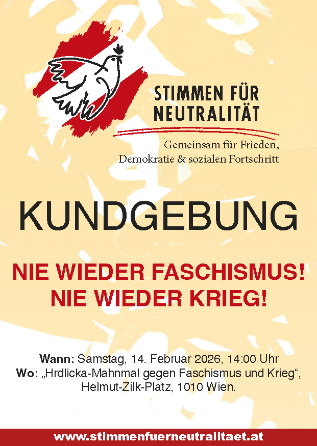 Stimmen für Neutralität! Gemeinsam für Frieden, Demokratie und sozialen Fortschritt; c/o Schottenfeldgasse 24/3a, 1070 Wien; www.stimmenfuerneutralitaet.at; Kontakt: office@stimmenfuerneutralitaet.at